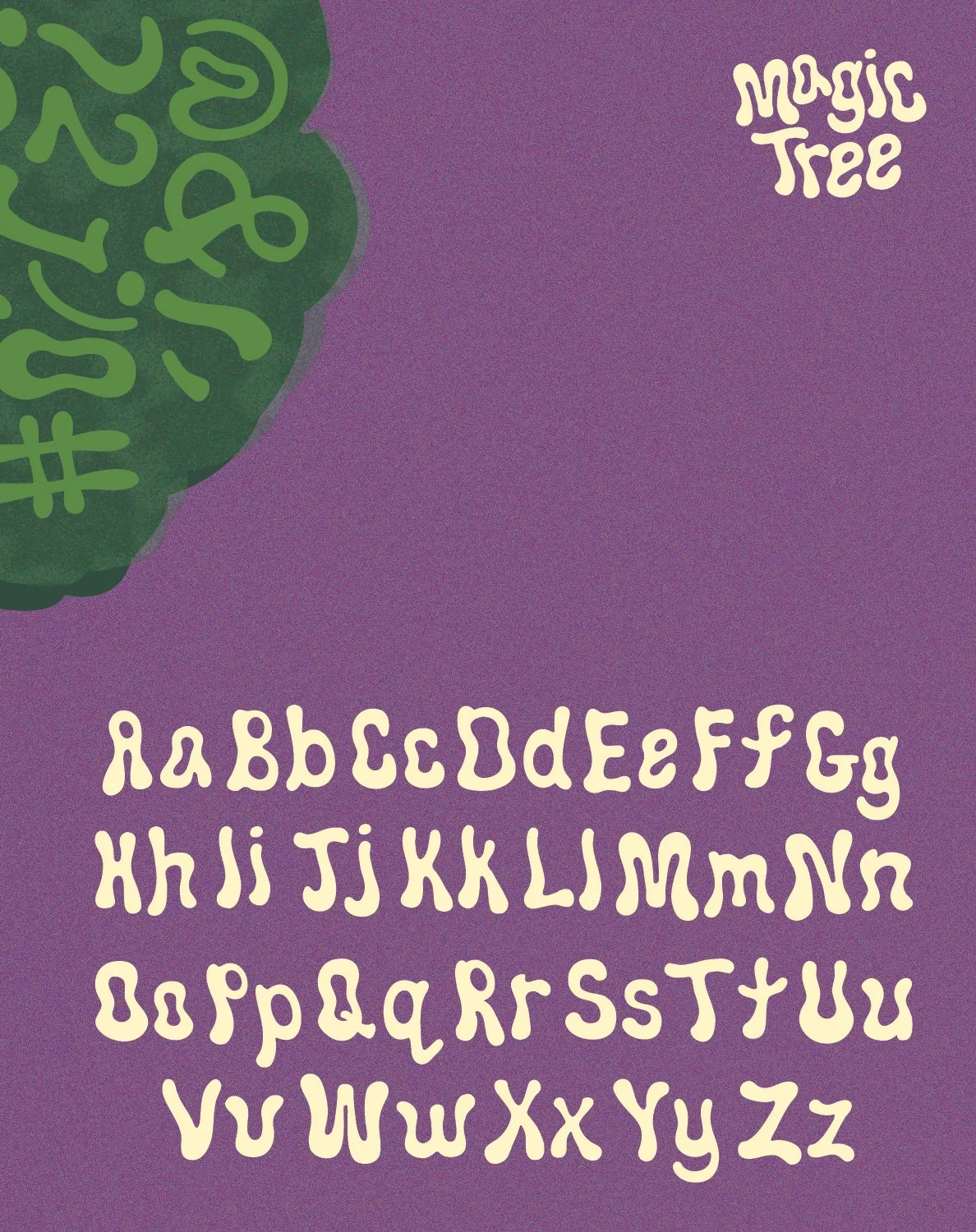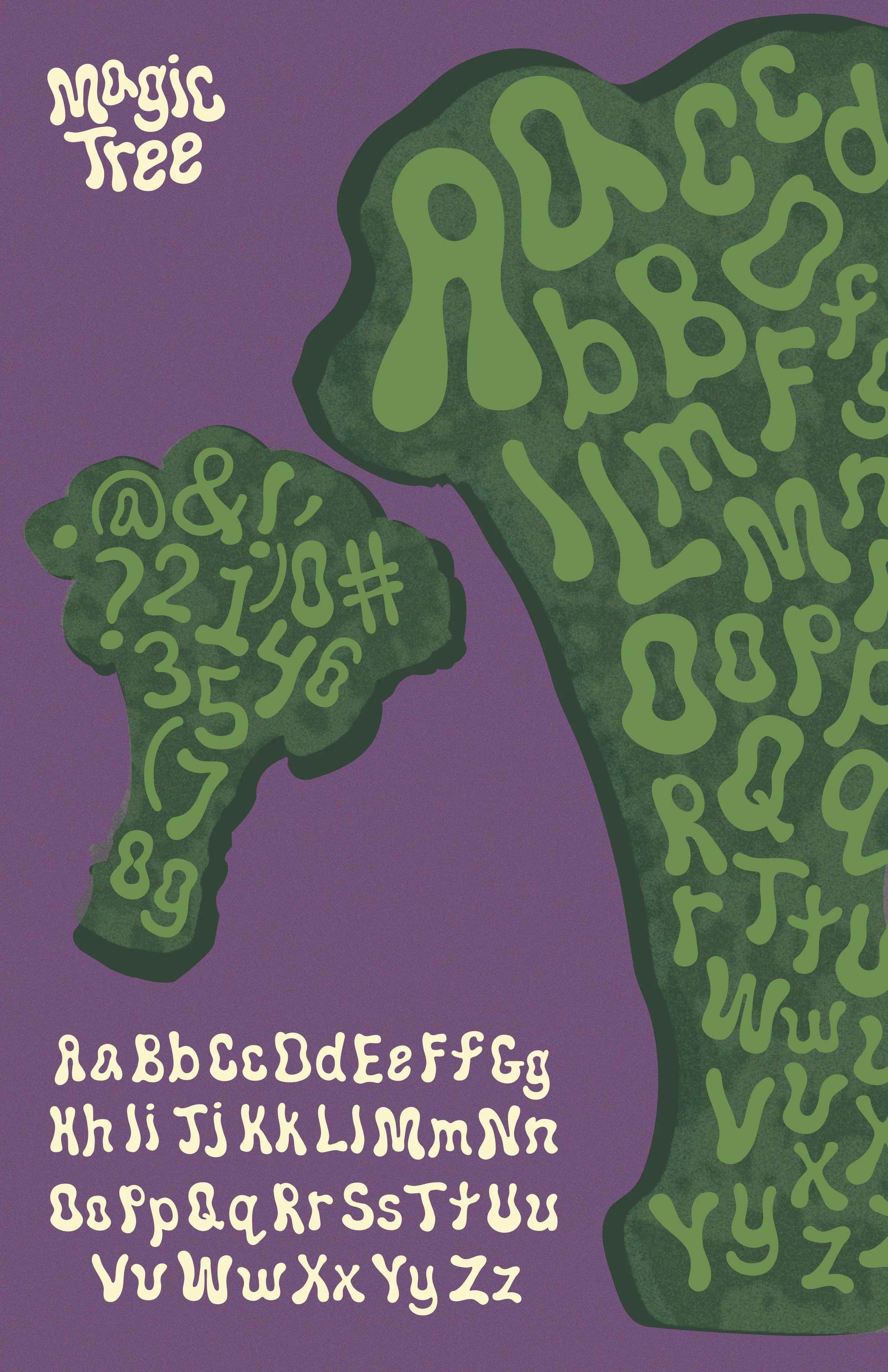 Magic Tree is a decorative font inspired by the organic movement and playful structure of broccoli. Broccoli’s branching stems, abundant amount of florets, and natural curves informed every letterform, translating the vegetable’s bendy silhouette into typographic expression. The font balances softness and structure, mimicking how broccoli feels lively and fun. Inviting viewers to see familiar forms in a new way, the typeface is designed to feel imaginative and slightly magical. A wise person once said “Broccolli is not that serious.”