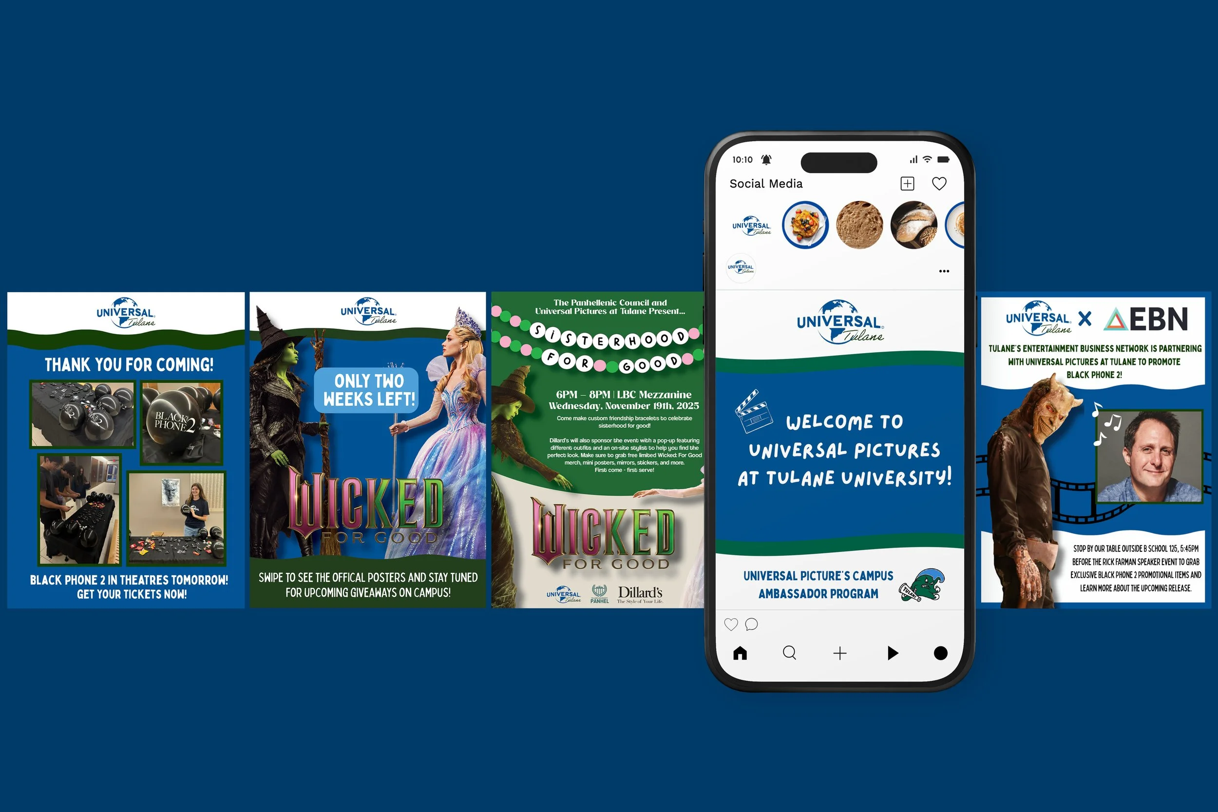 As the Universal Pictures Marketing Intern at Tulane University, I acted as the main link between Universal and the student community. I helped bring upcoming film releases to life on campus by planning and executing creative promotions, producing social media content, and supporting fun brand activations that encouraged student engagement! Below are some events that I set up, as well as the branding and logo I created for our socials.